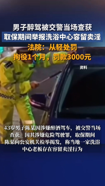 43岁男子陈某因涉嫌醉酒驾车,被交警当场查获。因其涉嫌危险驾驶罪,取保期间,陈某向公安机关检举揭发,称当地一家洗浴中心老板存在容留卖淫行为。